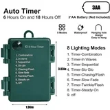 IP65 waterproof rating of string lights and battery box is equipped with a timer function (pre-programmed timing sequence of 6 hours ON and 18 hours OFF over each 24 hours period) and 8 modes (Combination, In Waves, Sequential, Slo Glo, Chasing/Flash, Slow Fade, Twinkle/Flash, Steady On).
